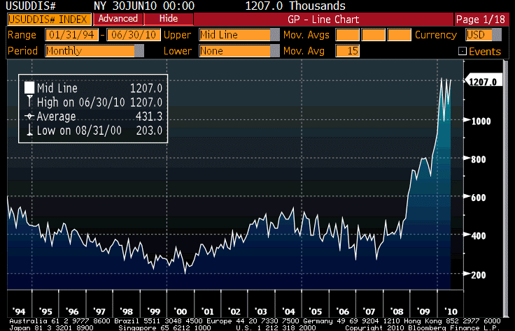The length of the average workweek dipped slightly. This number wiggles some from month to month, so by itself it isn’t so concerning. Average hourly earnings declined outright by 0.1%, the largest amount of this cycle. (When you combine those two facts – fewer hours and less pay per hour – it implies that income took a fairly large step back, at least on a monthly basis). And the reason for the decline in the Unemployment Rate appears to be not that workers are finding jobs, but that they are leaving the workforce because they are discouraged. The number of discouraged workers rose to a marginal new cycle high (see Chart below, source Bloomberg). People, in short, are giving up and dropping out of the work force.