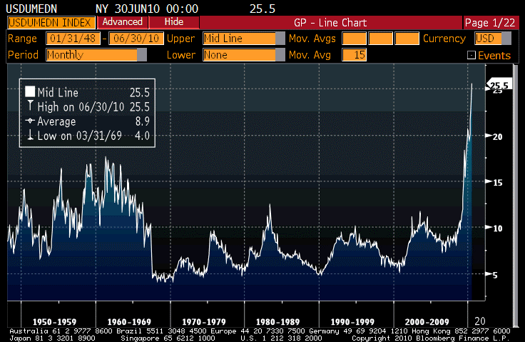 And small wonder. The median unemployment duration went to a new all-time high (since the 1940s, anyway, when that series begins) and shows no signs of slowing its ascent (see Chart below, source Bloomberg).