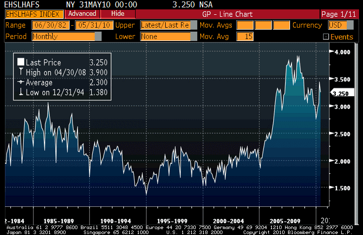 The market made the reciprocal mistake in 2006, when the inventory was under 7 months of sales, but that was only because of a ridiculously high selling rate. The total inventory number told the real story: that there were an awful lot of homes out there, and if the pace of sales were to decline there would be a big problem. Looking at the ratio obscures this important detail. (People make the same mistake with the semiconductor book-to-bill ratio, where each part of the ratio matters too). Ratios like this are only particularly useful if the denominator is pretty stable.
