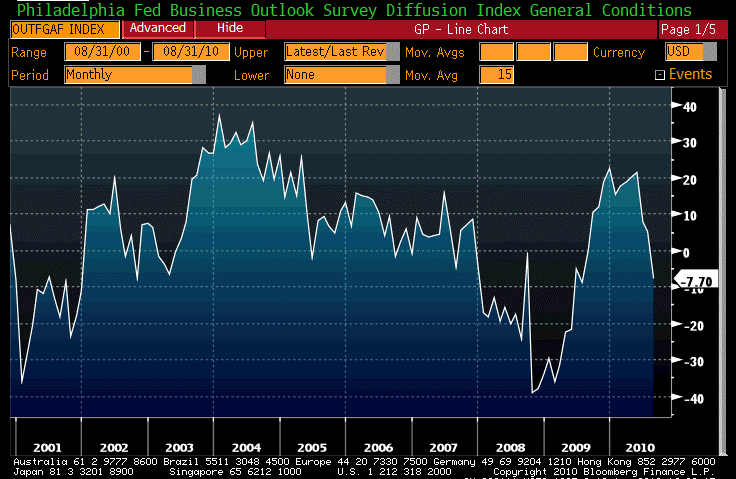 Now, note that the Philly Fed index is pretty volatile. So this is a good time to think in terms of rejectable hypotheses. Last month, I would have said the dip is concerning, but at the limit of what might be acceptable volatility for an economy still expanding. This dip, however, is sufficiently large that I believe we can dismiss the hypothesis that the economy is still growing as strongly as it was in Q1 and Q2 (when the government was stimulating the economy, that is). At -7.7, given the volatility of the series, we can’t be sure the economy is actually contracting, but at least in the Philadelphia region it is probably pretty close to zero.