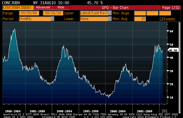 Stocks probed lower again this morning, with the S&P bouncing again off the 1040 mark. I suggested before my vacation that the 1046-1070 range was the “indecision zone,” while below that level it would be obvious to all that further declines are in store. It is starting to look more like the narrower 1040-1046 range is the Maginot line that the bulls are defending and the bears seeking to overrun. The data were supportive at the margin, with Consumer Confidence actually rising – but that was only because the “expectations” component rose from 72.5 from 67.5. The “present situation” component, which is the one that is actually correlated with stuff, fell to 24.9 from 26.4, and the “Jobs Hard To Get” subindex (which is correlated with the Unemployment Rate) rose to 45.7, the highest level since March although the chart below makes it plain that this is better considered to be a range trade itself.