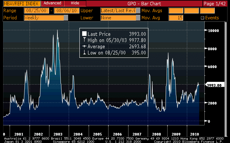 This would not be awful news, on some level. Prepayments are generally caused by refinancings, and the refi market has been pretty dormant for a while because credit has been scarce (it is hard to refinance if no one will extend you the loan at the new rate). The chart below of the Mortgage Bankers Association Refi index shows that activity has been picking up recently although it remains well below the standards of previous refi waves.