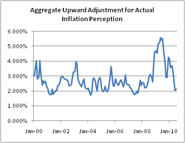 The details, as I say, are probably not of much interest to most readers of this column. But the charts will be. The tricky part is calibrating the lambdas, and this can and should be done more diligently in a behavioral economics laboratory. But with the choice of lambda that I thought to be “about right,” here is the aggregate upward adjustment that should be made to CPI to get to perceived inflation.