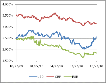 You can see that since late August, US 10y inflation swaps have risen around 50bps (depending on the exact day you choose to count from). I choose August 27th, because that is the day that Bernanke delivered his speech at Jackson Hole. 10y US CPI swaps closed at 2.08% that day; today those swaps finished at 2.54% (the latest 2 days are not reflected on the chart). I show the inflation swaps because it seems very clear that the move was not echoed in the UK or European inflation markets. US rates moved from being closer to the European standard (the ECB to date is assumed to be more hawkish on inflation because of its Bundesbank DNA, although I have my doubts how long that can hold) towards the regime where quantitative easing is already a reality.