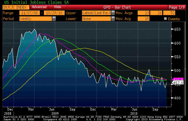 On the economic data front, Initial Claims were weaker than the majority of economists forecast. Claims rose to 457k. I suggested yesterday that this was likely, since the BLS last week stated that seasonal adjustment issues had led to the surprising decline in Claims. But economists can be very gullible in the direction of their pre-existing bias, and economists have been looking for a recovery in Claims for a long time. Maybe the job picture is improving some, but one week below 450k does not a trend make. We cannot reject my current null hypothesis that Claims continue to float along at a steady run-rate of 450-475k (see Chart). So Claims fails as an explanation because it is in the wrong direction to help equities, and it is one day in front of Employment anyway. The Productivity and Unit Labor Cost data fail as an explanation because those are pretty useless economic data until roughly the 25th revision. We don’t know how to measure either of these quantities well, and they rarely move markets.