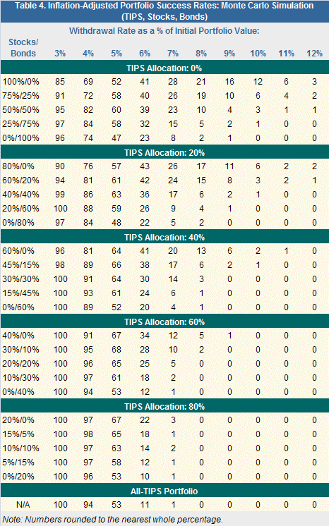 One of the important things I do in the paper (at least, I think it is important) is to update a table that appeared in the original Trinity Study showing “portfolio success rates” for various combinations of stocks and bonds. When the original study came out, inflation-linked bonds were just getting started, so this important asset class wasn’t included. The analogous chart, based on Monte Carlo simulation (see the paper for more details) and including TIPS, is below.
