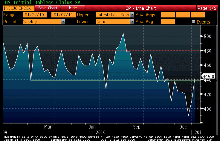 The report from the Labor Department that weekly initial claims for unemployment insurance rose to 445k versus expectations for 410k. Again we see that forecasters have gotten a bit too ebullient about the recent data. While our eyes tend to see on the chart (see below) a clear downtrend since August, statistically that downtrend isn’t there – because in August, the true underlying level of Claims wasn’t 500k, but more like 460k. Remember, these data are only samples of an underlying distribution that we cannot perceive directly. The spike in August tempted us to wonder if the second dip was beginning, but in fact it wasn’t. The July dip was paid back by the August jump, while the underlying process remained fairly stable.