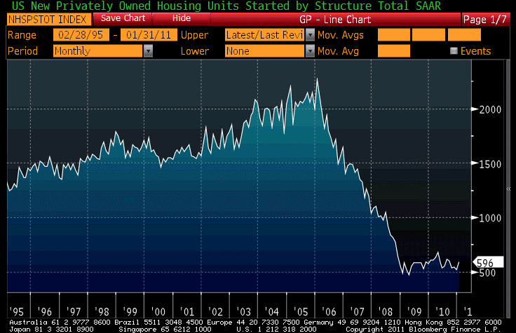 On the data front, strong Housing Starts (596k vs. 539k expected) kicked off the day. The market reacted with characteristic giddiness to the 14.6% rise month-on-month but as the oft-shown chart below shows, the correct response is “who cares.”