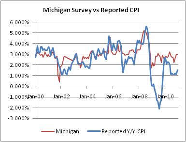 For example, in 2007 Frederic Mishkin described recent changes in the persistence of inflation, the tradeoff between inflation and unemployment, and the responsiveness of inflation to other shocks as a function of well-grounded inflation expectations; to proxy inflation expectations he used the Livingston survey and the FRB/US survey which itself consists of the Hoey survey and the Survey of Professional Forecasters (SPF), and also referred to the Michigan Survey of Consumer Attitudes and Behavior (Michigan survey). But what in the world does a survey of professional forecasters have to do with consumer inflation expectations? And the Michigan Survey shows strong evidence of “anchoring,” a cognitive bias where a respondent starts the process of determining an answer by choosing an “anchor” and then making an adjustment to arrive at his/her conclusion. So, for example, a Michigan respondent is probably aware (unless they live in a hole) that inflation was just reported at 1.5%, or that it is “around 2%”, and then says “my experience is a little higher.” The chart below shows the Michigan Survey “1 year ahead” inflation expectations versus actual reported headline CPI.