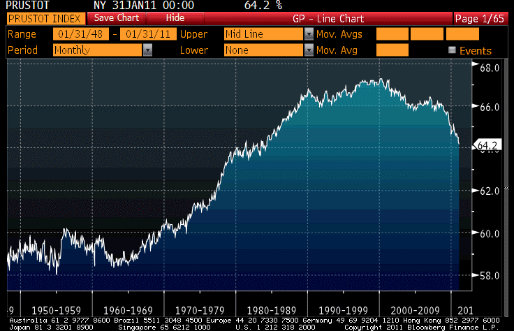 Many people have pointed out the steady decline in the Labor Force Participation Rate, which peaked in January 2000 and has been dripping lower ever since. It stabilized briefly in 2004-2007, but the second recession of the decade sapped it further.