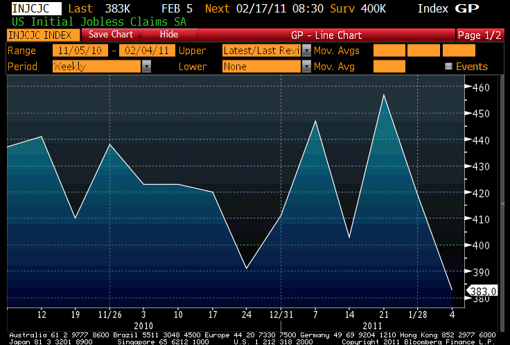 In addition to the unrest in Egypt there was unrest at the Fed. Governor Kevin Warsh, who had been openly critical of the Fed’s decision to implement QE2, resigned his post after five years on the FOMC. While this supposedly has nothing to do with policy disagreements, there is room for skepticism on that score.