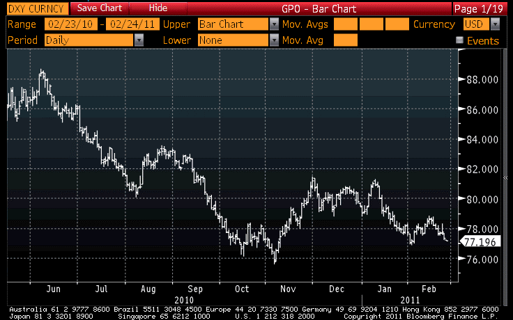 Those two facts suggest that stocks are not declining merely because of unrest in the Middle East. Perhaps there is a whiff of a stagflation outcome, but that shouldn’t pressure the dollar since energy is an input into inflation globally. I think Libya may be the excuse for the equity break, in other words, but not truly its cause.