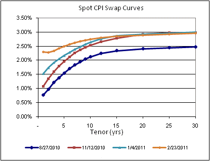 This seems like a useful time to step back and look at what has happened to inflation expectations since the Fed has begun its current easing campaign. The chart below (Source: Enduring Investments) shows the CPI swap curves for August 27th (the day Bernanke made it plain QE2 was coming), November 12th (the day QE2 technically began), January 4th (where we started the year), and today.