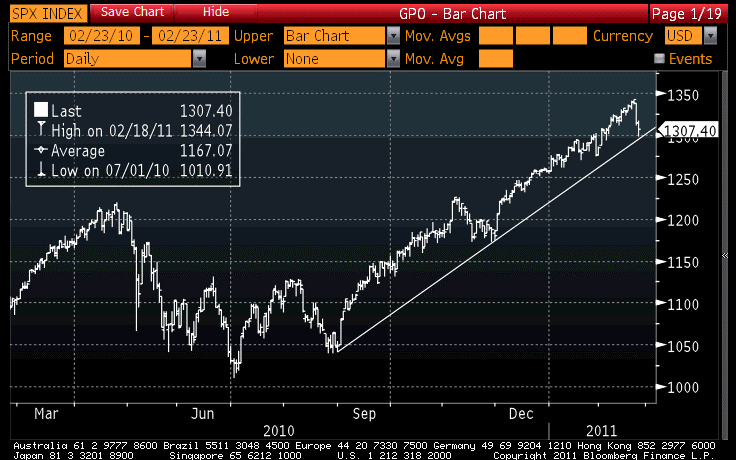 Tomorrow’s economic data includes Initial Claims (Consensus: 405k vs 410k last), Durable Goods (Consensus: +2.8%, +0.5% ex-transportation), New Home Sales (Consensus: 305k vs 329k last), and even the FHFA Home Price Index. I am not sure any of this really matters as much as Libya and the rest of the region; as much as the Irish elections on Friday; or as much as any erosion in sentiment among the true believers in the equity world. I remain close to home.