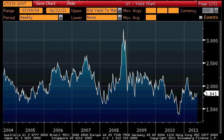 Well, we shouldn’t forget about this little effect as well: QE2 also kept Tim Geithner in his job for far longer than was good for the country. Obviously, Geithner knows that his job was made easier by the fact that the Fed was buying 85% of the Treasury issuance since November, and virtually 100% of the net TIPS issuance: he has apparently decided to “weigh” moving on from Treasury as soon as the budget deal is done. I’m sure the timing is completely coincidental and has nothing to do with the fact that the next guy is going to have to find a new $600bln buyer to take the Fed’s place (and maybe a bigger buyer, if the Fed ever decides to sell). “Not it!”
