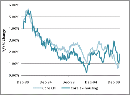This rise is starting to be flattered (and flattened) once again by the slower rise in Housing inflation. Core ex-housing (see Chart) is up to +1.83% from 1.08% back in December. While it had been up to almost 3% in late 2009, the upward direction has been re-established fairly clearly.
