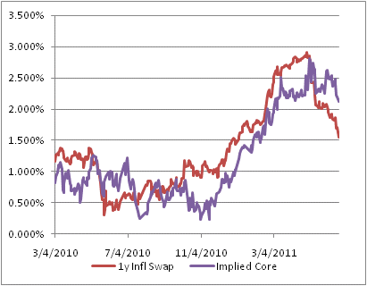 Interestingly, the inflation markets are also acting optimistic on the general pricing environment. While both real and nominal interest rates continue to drift to ever-lower levels (generally, although not today), the implied core inflation has remained surprisingly static as well as high compared to the current level of core. The chart below is an updated version of a chart I have run before. It illustrates that the sharp decline in 1-year inflation swap quotes is mostly explained by the drop in forward energy prices. The red line is the 1y inflation swap; the other line is the residual after subtracting out the movement implied by energy futures.