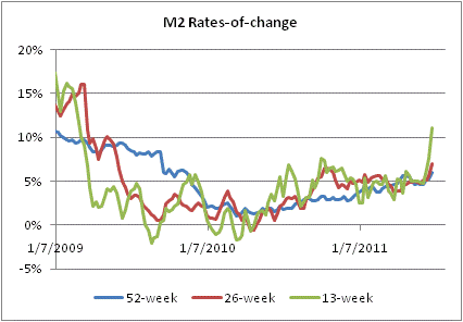 One additional worry just cropped up today with the release of the weekly money supply numbers. There was a very large increase in the latest week, which brings the annualized 13-week growth rate to 11.1% (highest since March 2009), the 26-week growth rate to 7.0% (highest since June 2009), and the 52-week growth rate to 6.1% (highest since November 2009) – see Chart.
