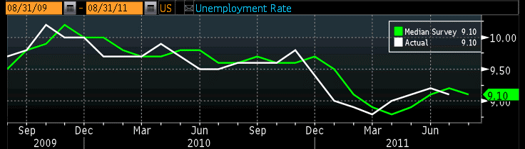 Can the stock market survive a negative print, or a rise in the Unemployment Rate? The consensus estimate for the rate calls for it to be unchanged at 9.1%, but the large jump in the “Jobs Hard to Get” reading in the Consumer Confidence report suggests that a rise is likely. Do I feel bad going against the grain and ‘forecasting’ (as much as I ever do play that game) a 9.2%? Not really. Look at the chart below, from Bloomberg, and see if you can divine the economist heuristic for estimating the Payrolls number.