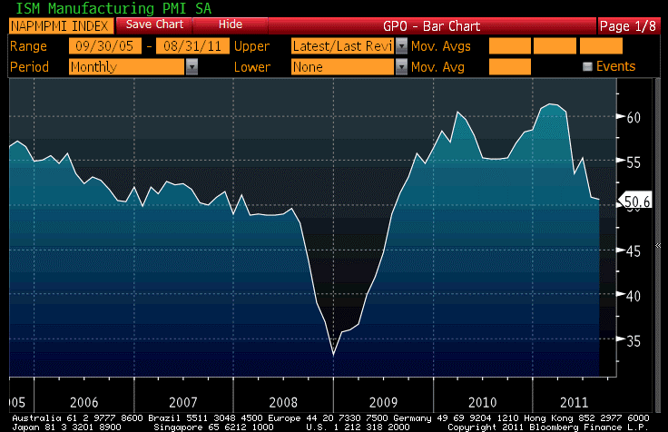 The heartwarming message delivered by today’s ISM figures was all is not lost. It could be worse. Against expectations for a 48.5 print, the rumor started swirling about ten minutes before the number that the actual figure would be around 43. When the true data showed up at 50.6, there was a sigh of relief and a swift pop in the stock market. Bonds took a beating at the same time. The message sent by ISM is this: manufacturing is not in a recession (to be sure, 48.5 wouldn’t have indicated a recession either, because negative growth is associated with a number a few points below 50, but the symbolism is important).
