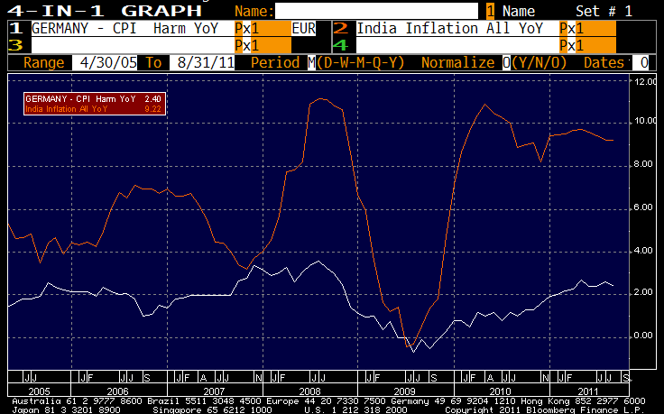 As additional commentary in the “one picture is worth a thousand words” category, see below the Indian inflation trade (in red) and the German inflation rate (in white). One of these wants to issue inflation-linked bonds; one has abruptly decided not to issue any more right now because they don’t need the money and besides, no one wants them.