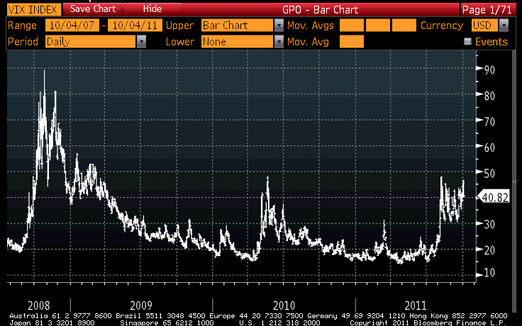 However, I am not anxious to jump into these asset classes, nor to short bonds just yet. Partly, this is because I think there is a fairly large chance that we are still due a big crunch in Europe, but partly because I haven’t seen any sign of a washout yet. I am intrigued with the behavior of the VIX (see Chart, source Bloomberg), which has been doing something really remarkable. After the spike above 45 in early August, it has never retreated below 30. For two months, it has remained elevated without spiking further. This is unusual, as I think the chart makes clear. Ordinarily, the VIX will spike, then retreat. It almost never spikes, then remains at that level.