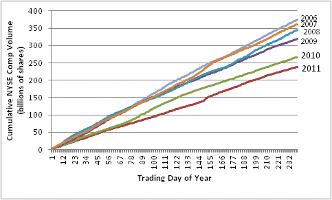 Equity volume was a bit higher than recent standards, but liquidity is going to be an issue if there are any surprises over the next couple of weeks – for example, if Italy’s auction on Wednesday is not well-received or if S&P downgrades France the full two notches rather than only one. This is mostly a year-end issue, but as I have pointed out all year, equity volumes this year have been consistently lower than in prior years. The following chart shows cumulative NYSE Composite Volume through the first 240 trading days of the year. The volumes leading up to and since the Volcker Rule assault on dealer market-making abilities (aka “proprietary risk taking”) have been demonstrably lower than in the four years prior. I am sure there are other secular pressures on equity volumes, but in any event it seems obvious that we are in an era of less volume and diminishing market liquidity. (This should by the way favor small investment managers, who have lower market-impact costs of trading…which is another trend I see continuing.)