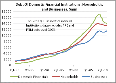 The ‘news’ of the day being thus dispensed with, I can proceed directly into a belated observation or two about the Fed’s Z.1 “Flow of Funds” release that was posted in early December. The Z.1 is a rich source of bauxite with just a little alumina within it, but one does occasionally find something valuable and/or interesting. I like to plot the debt numbers in various ways, because the Fed helpfully slices up the debtors into convenient categories (although they seem to still include Fannie Mae and Freddie Mac debt in “private” domestic financial institutions, which is a ridiculous fiction. More on the impact of that fiction in a moment).