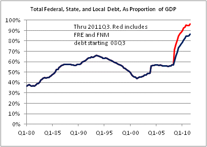 That would not be a big story in itself, but the red line is. The red line is the ratio if you simply recognize that Fannie Mae and Freddie Mac debt are de facto obligations of the Federal government. And that ratio is at 96.1%, and will almost certainly exceed the magical 100% level by the middle of next year.
