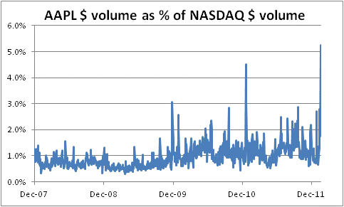That’s not the only reason that the landscape suddenly looks less inviting for investors. Let’s talk about Apple. Now, I am a big fan of Apple products. I will note the Graham and Dodd admonition that a good stock differs from a good company in that a good stock is also cheap, but I’m not passing judgment on the valuation of Apple stock. Frankly, it’s not even a stock I watch very much, because it doesn’t pay a dividend and stocks of that type don’t generally interest me (firms that distribute dividends historically have tended to have a higher ROE). But today, when a highly-touted stock hits a new high and then reverses on huge volume – especially in an otherwise-somnolent market – it is a bad technical signal. When I say huge volume, I don’t just mean it was the highest share volume since January of last year. Keep in mind that the price is also some 45% higher now, and also keep in mind the aforementioned sleepy-market context. The chart below shows what I mean: Apple’s dollar volume today (with no news evident that I could see), on a day it set a new high and then reversed, was an absurd 5.2% of the total dollar volume traded on the Nasdaq. And frankly, that understates the point since I valued the dollar volume as the total shares traded times the closing price, and the closing price for Apple was the low of the day and more than 5% below the day’s highs.