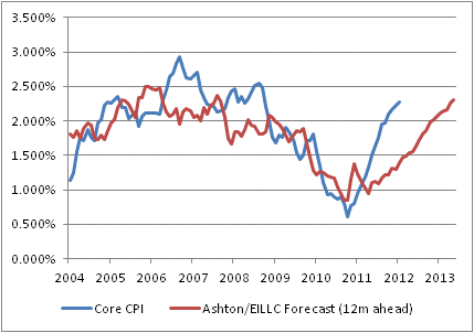 So, you would think that these few paragraphs would be criticizing the forecast of Goldman Sachs. But that’s not really my point. Really, I want to point out the really hysterical part of the note, and observe why sell-side economic analysis is so useless (although some economists at Goldman, to be fair, are quite good). Goldman says “Although the model failed to capture the sharp pick-up in inflation in 2011, our bottom-up analysis suggests that this deviation was chiefly driven by special factors outside of the scope of the model, including pass-through from surging commodity prices and a spike in auto prices.”