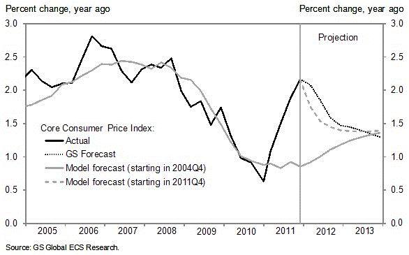 Goldman Sachs Global Economics, Commodities and Strategy Research today produced a piece called “The Top-Down Logic for Our Inflation Forecast.” In it, the economics team explains why they are calling for core inflation to fall to 1.5% in 2012, and 1.3% next year. Their reasoning is the “the combination of labor market slack and anchored inflation expectations should reassert itself in lower core price inflation over time.”