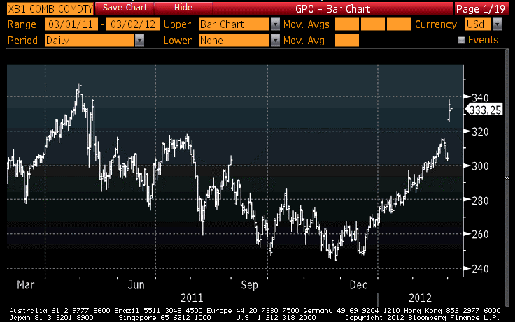 Front and center must be the huge rise in Crude Oil and Gasoline futures. Crude rose over $3 with NYMEX Crude topping $110. Some of this was due to rumors that a Saudi pipeline had been attacked and damaged, but a good portion of the run-up occurred before the rumor went around, and after the Saudis denied the rumor prices only fell back somewhat. The chart below (Source: Bloomberg) exaggerates the move in gasoline somewhat due to the fact that the front month rolled (the April contract rallied 9.45 cents/gallon, but March expired as the front month on Wednesday at $3.04 and April is now at $3.35), but however you want to look at it, this is a very high price for March 1st – in fact, the highest ever – and retail gasoline prices were already up to $3.74/gallon before this spike.