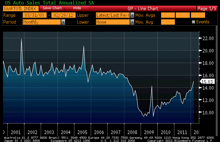 There are positive economic signs, but I fear these may be the best we see for a while. Auto sales, which have long languished at weak levels, surprised in February to post the strongest annualized sales pace since 2008 (see Chart, source Bloomberg). The level is almost back to the record levels where the car companies were bleeding losses back in the mid-2000s! The worst seems to be past for the automakers, although there is some suspicion that balmy weather (for February) helped the comparisons for the month. Still, the trend seems to be clear, for now.
