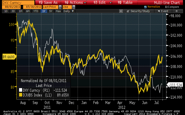 Since commodities for the most part are priced in dollars, it is natural that they tend to move in the opposite direction from the greenback. When the dollar strengthens, then commodities are more expensive to non-dollar consumers, and they demand less. Yes, of course there are other factors, but when there are no stronger underlying currents then commodity indices tend to move inversely to the dollar. The chart below (Source: Bloomberg) illustrates the strong coupling of the dollar index (here inverted) and the DJ-UBS Commodity Index in yellow, both normalized to August 1st, 2011.