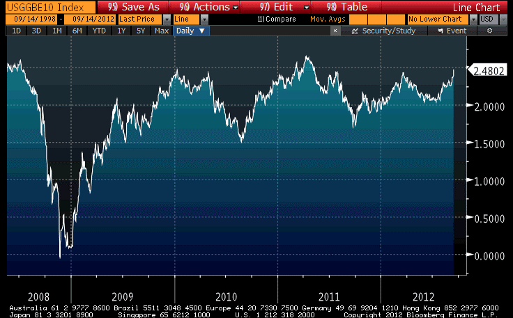 And throw they did – in fact, in recognition of the similarity between the money-flinging bandits and the Federal Reserve chief, I move that we retire “Helicopter Ben” as a moniker in favor of “Mercedes Ben,” which anyway has a better ring to it (and a built-in song). Interestingly, despite all indications – quite deafening indications to anyone who has listened to Fedspeak for any length of time – that the Fed was planning another dose of QE, a surprising number of investors were evidently surprised. There were no bad bets from the long side today: stocks launched higher on the news, gaining 1.6% to four-and-a-half-year highs. The DJ-UBS commodity index rose 0.7% to a one-year high (up 18% since mid-June). Treasuries gained (although it is hard to fathom exactly why, since the Fed will be buying mortgages, not Treasuries), with the 10-year note rallying 4bps to 1.72%; but TIPS launched higher with 10-year yields falling 13bps (to an all-time low of -0.76%) and the 5-year TIPS dropping 16.5bps to -1.62%. This sent breakevens sharply wider, with 10-year breakevens up 9bps on the day to 2.48%, the highest since last May. The all-time high for 10-year breakevens is around 2.78%, which is still a fair bit away; but, by the same token, 10-year breakevens touched 0% in late 2008, had lows of 1.52% in 2010 and 1.71% in 2011, and are up 41bps since July 26th (see Chart, source Bloomberg).