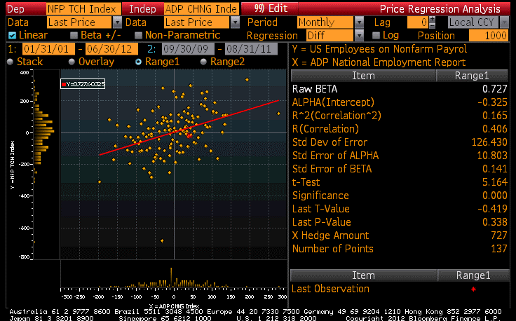 Now, perhaps the rally in equities wasn’t due to the ECB’s offer to buy bonds after all. Maybe it was because the economic data was slightly stronger than expected, although I’m skeptical of that. ADP showed a gain of 201,000 jobs, the highest gain since March, plus an upward revision to 173,000 last month. Initial Claims were a bit lower than expected, at 365,000. These are both on the better side of expectations, but negligibly so given the size of the error bars involved. The ADP report may have encouraged some shorts to cover in front of the Employment Report tomorrow, but the short-term correlation between changes in ADP and changes in the Employment Report is quite poor, as the chart below shows. The R-squared of the relationship is 0.165. That is, if you know that ADP accelerated 28k this month compared with last month, it tells you almost nothing about whether Non-Farm Payrolls will accelerate or decelerate from last month’s figure.