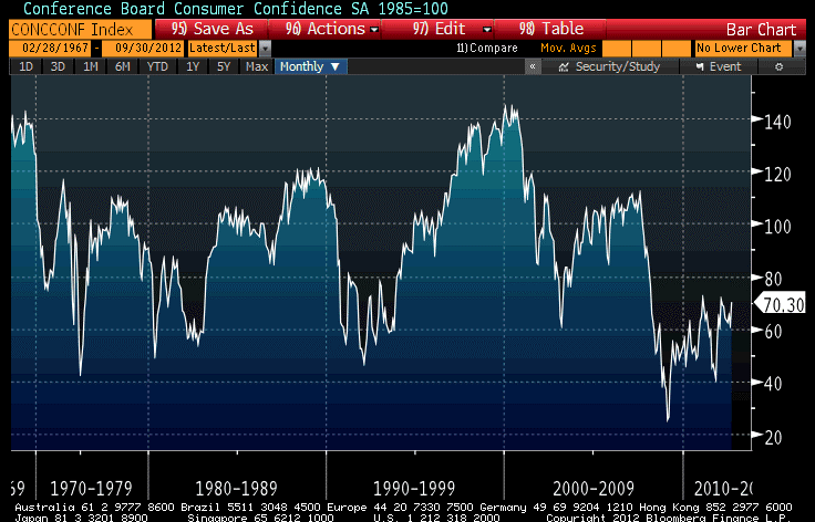 There was some mild good news today. Consumer Confidence rose more than expected, to 70.3 and only a couple of points below the post-Lehman highs set in early 2010 and 2011. Yes, 70.3 is still very low (the series is set so that confidence in 1985 equals 100, and in the recessions of the early 1980s and the early 1990s it was generally in the 55-80 range), but the longest journey begins with a single step. On the bright side, there’s lots of room for improvement (see chart, source Bloomberg).