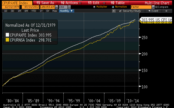 Why would an investor care about core inflation? Is it because he “doesn’t care about buying gasoline and food”? No, an investor may wish to buy a core-inflation-linked bond for the same reason that a Fed governor wants to focus on core even though all prices matter: core inflation moves around less in the short run, but in the long run core and headline inflation move together. The chart below (Source: Bloomberg) shows the core CPI price index, and the headline CPI price index, normalized so that they were both 100 on December 31, 1979. Since then, prices have tripled, whether you are looking at headline or core. The difference in the compounded inflation rate? Core inflation has risen at a 3.471% inflation rate, while headline inflation has grown at 3.415%.