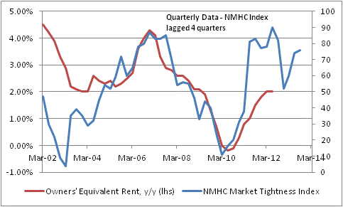 This regression is not as tight as the one between rents and OER, but the R2 is still about 0.48 since 2003. Moreover, the current level of the Market Tightness index points to an OER over the next year just a bit above 3%.