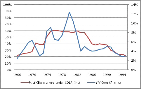 The chart shows that in the weak, inflationary economic environment that prevailed in the 1970s, one of the things that happened is that even while the overall proportion of unionized workers was declining (as it has done more or less consistently since 1954), the unions were gaining strength relative to management and able to force into CBAs clauses that tended to institutionalize inflation. The key point here being that this happened even while the economy was in a growth malaise. When the economy is weak, the protections offered by unions seem more attractive, and businesses are less able to resist union pressures.