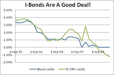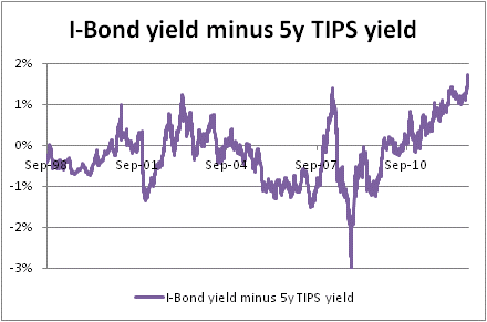 Which brings me, actually, to the main topic I wanted to discuss today. A reader asked me the other day about I-series savings bonds from the U.S. Treasury. For those of you who aren’t familiar with them, I-bonds are like regular savings bonds except that they pay a real interest rate. That is, instead of getting a fixed coupon, you get a fixed coupon plus inflation, which is added to the principal and compounded until the bond is redeemed. You can buy them on Treasury Direct and keep them in electronic form, and in fact that’s the best way to buy them. You can buy up to $10,000 per Social Security number per year.