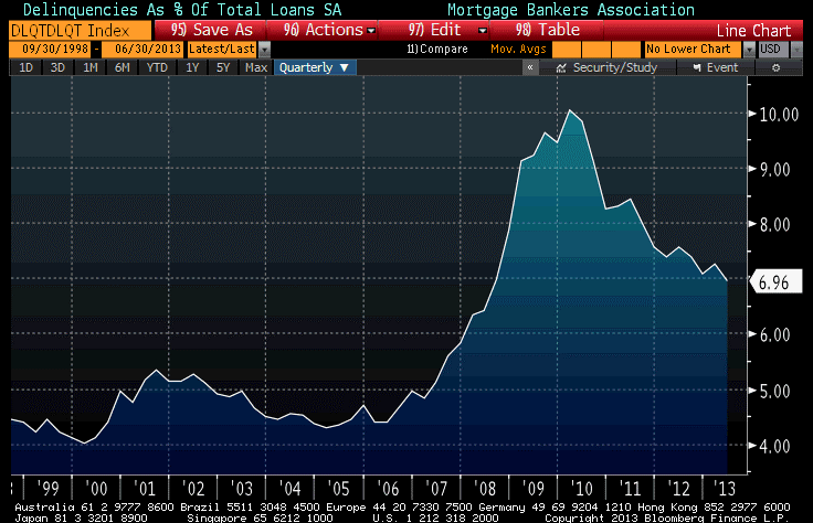 The great news today is that mortgage delinquencies dropped to their lowest level in five years. Look at the chart (source: Bloomberg)! Doesn’t it look great?