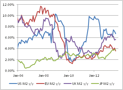 globalinfAnd that is, of course, not unrelated to the fact that the ECB is the only one of the four major central banks to be presiding over low and declining money supply gowth (see chart, source Enduring Investments).