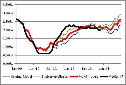 The black line is the actual Median CPI. The red line is the average of the other two models depicted as green and blue lines. The blue line is quite similar to the model I have been using for a very long time; it uses a couple of macro variables including a role for private indebtedness. The green line is something I introduced only in the last few years; it models shelter separately from the ex-shelter components because we have a pretty decent idea of what drives shelter inflation. Frankly, I like that model better, which is why my firm’s forecast for 2014 is for core (or median) inflation to be 3%-3.6%. The model says 3%, and I believe the tails are on the high side.