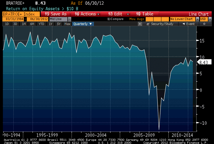 The parallel economic concept is that a greater of excess reserves increases the opportunity cost of reserves. The average return on assets for a bank gradually declines as more of these assets become excess reserves rather than required reserves against lent funds. Leverage also declines, with the result (as I have pointed out before) that return on equity suffers. The chart below (Source: Bloomberg) shows the return on equity for large banks (those with more than $10bln in assets). You can see that while bank earnings have recovered significantly from the nadir of the crisis, they also appear to have leveled off at around 8% compared to the 15% that was the consistent standard prior to 2007.