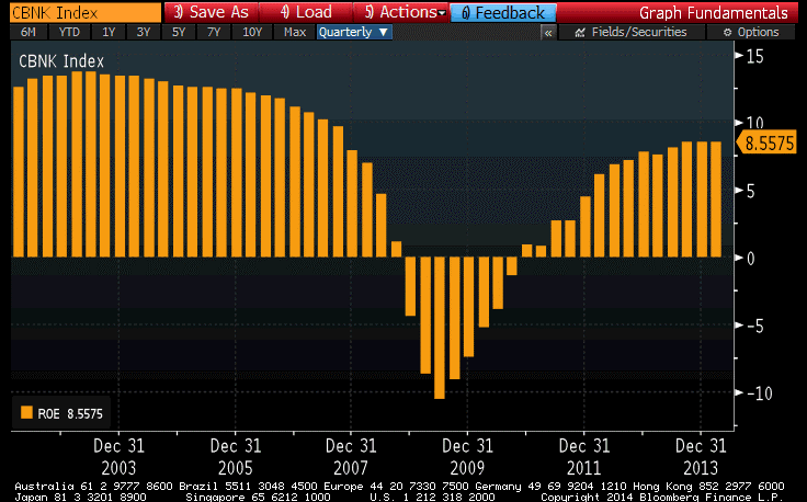 However, I digress from the other point I wanted to make that was suggested by the Sober Look article, and that is this: it continues to amaze me how well bank stocks are trading. I’ve been saying this for years – which helps to illustrate that I am a strategic investor, not a twitchy tactical guy. Return on equity equals gross margin (profit/revenue), times asset turnover (revenue/assets), times leverage (assets/equity), and for banks all three of these components are under pressure. Gross margin is under pressure from the movement of more products to electronic trading and from increasing legal bills at banks (the FX trading scandal is the latest threat of multibillion-dollar fines, adding to the LIBOR scandal and probes of the gold and silver price fixing system as sources of legal headaches for banks). Banks have been forced via the crisis to shed leverage, as a chart I recently ran illustrated. And low interest rates combined with large amounts of cash compared to loans on the balance sheet pressures the asset turnover statistic. So it isn’t surprising that bank ROEs are low (see chart of the NASDAQ bank index ROEs, source Bloomberg).