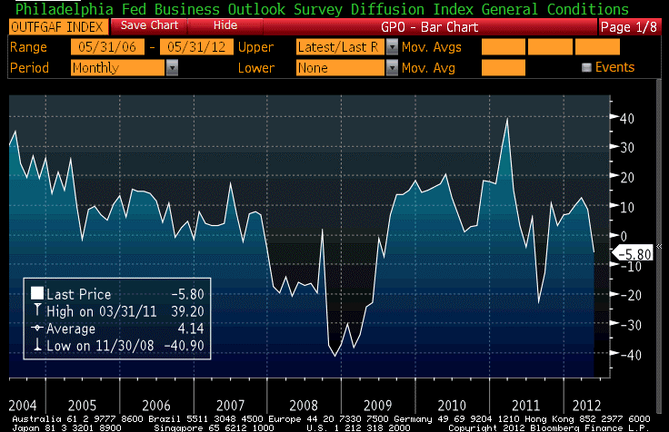 While the proximate trigger for today’s whipping may have been the weak Philly Fed index, which fell (see Chart) to the lowest level since the odd spike last year versus expectations for an increase, the market has obviously been in retreat for a while. Moreover, the idea that there was a “payback” due after strong weather-related growth in the spring isn’t exactly an epiphany.